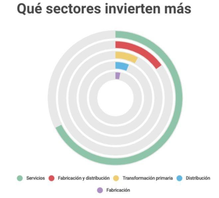 El 67% de la inversión corresponde al sector servicios, seguido por fabricación y distribución con 15,1%, transformación primaria con 8,1%, distribución 6,6% y finalmente manufactura con el 3,2% de los presupuestos previstos.