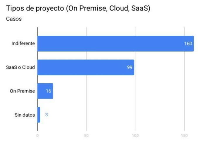Como se observa en el gráfico para el 57,5% es indiferente el tipo de proyecto que le proponga el proveedor. Así mismo la modalidad nube o servicio tiene una aceptación importante entre quienes se encuentran en la búsqueda de soluciones.